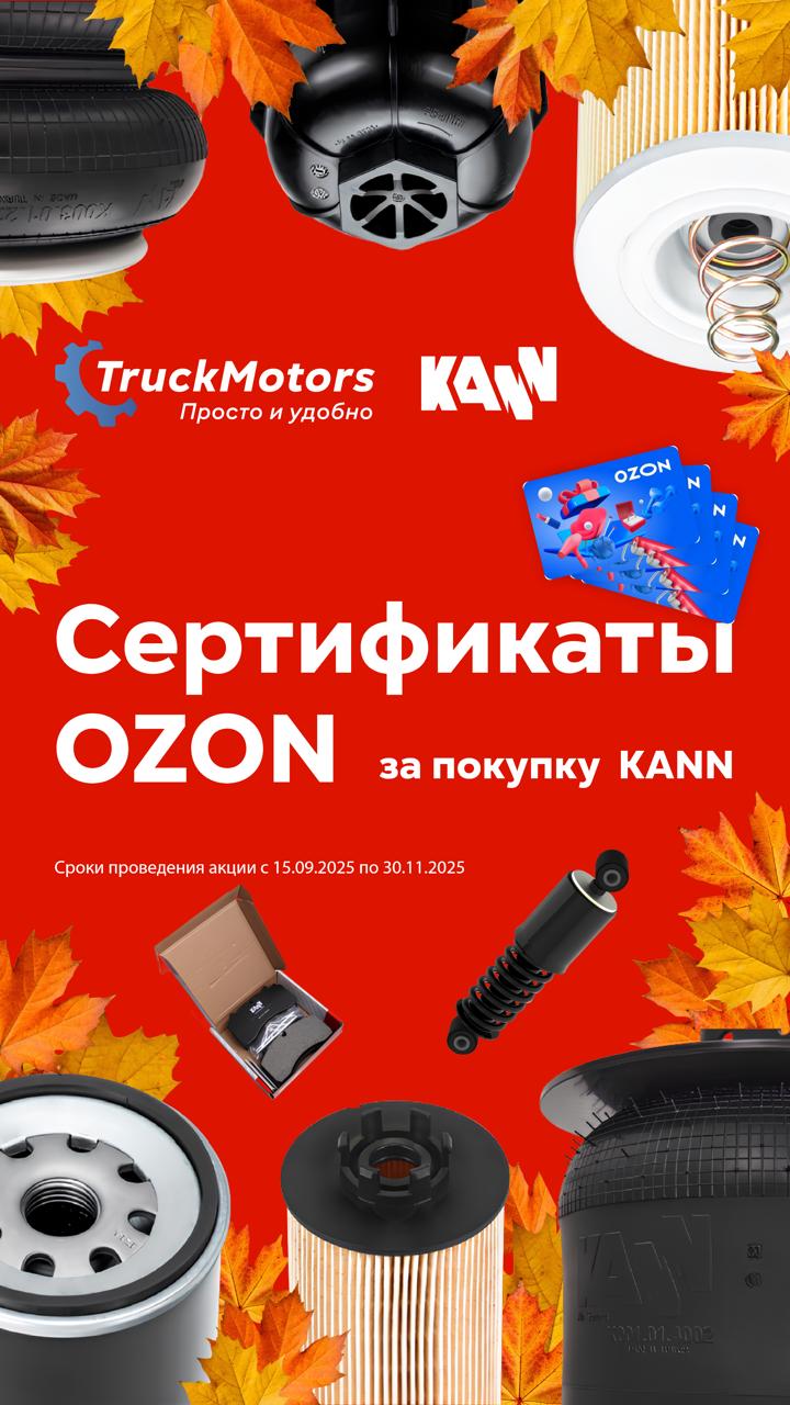 Уважаемые партнеры! С 15 сентября по 31 ноября 2025 г покупайте любую продукцию бренда KANN в ассортименте TruckMotors и получайте отличные подарки - сертификаты OZON!
